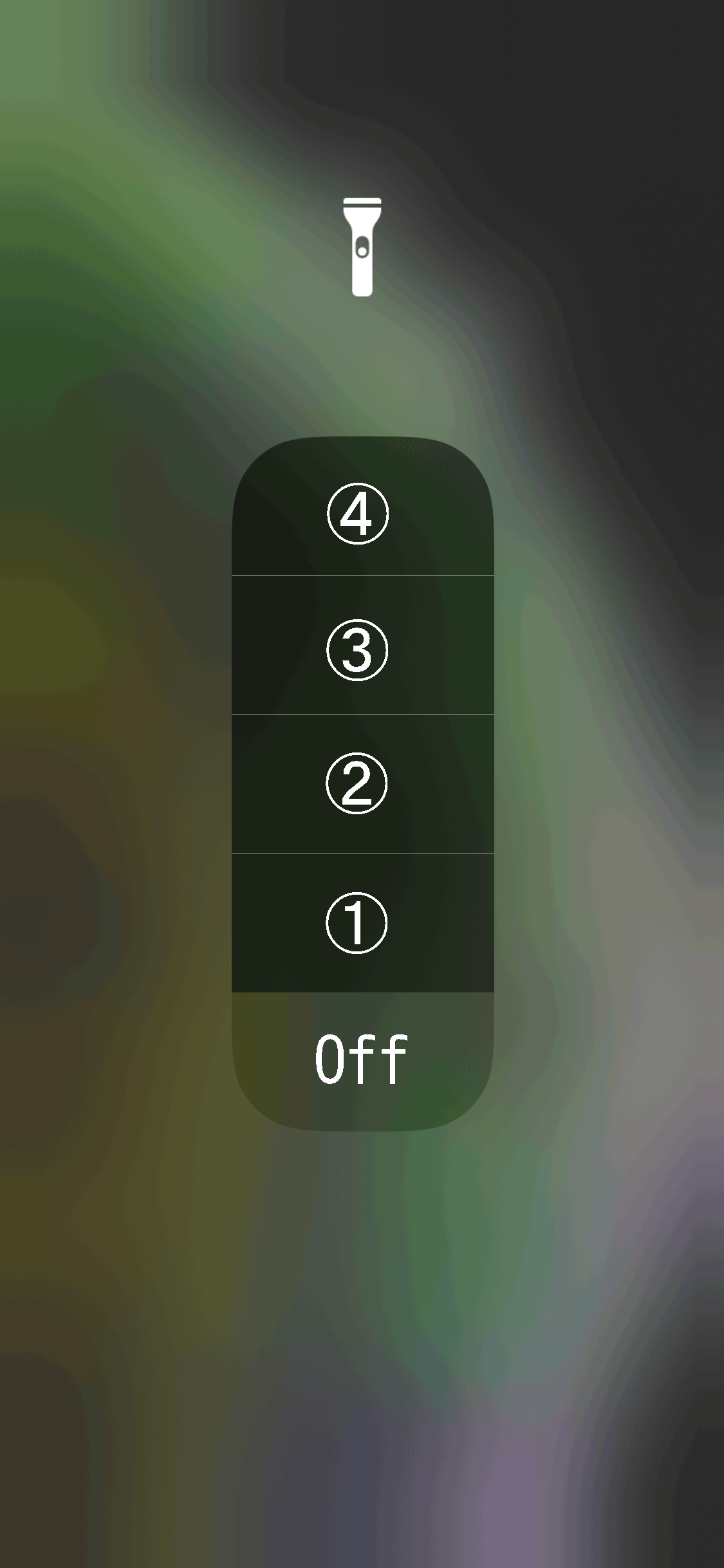 このような画面が表示されます。①が最も暗く、④が最も明るく点灯します。例えば、ここで②で設定すると、コントロールセンターで懐中電灯のアイコンをタップすると、②の明るさで点灯するようになります。