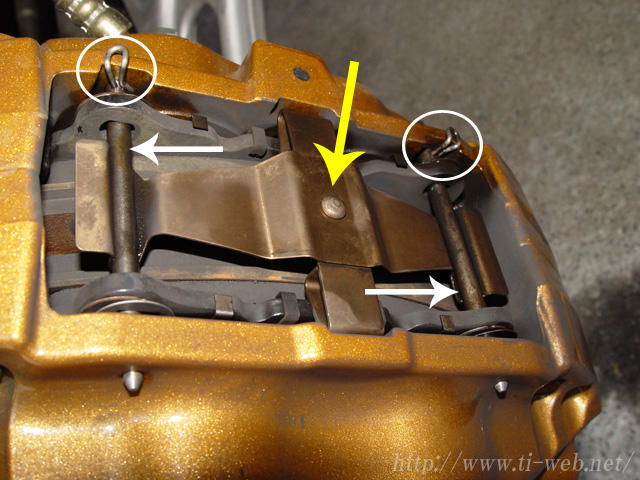 白丸で囲ったクリップ(2個)を外し、白矢印で指しているスライドピンを抜くと、黄色矢印で指してるクロススプリングが外れます。