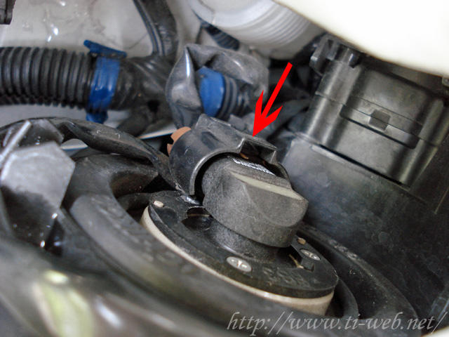左(助手席)側のバルブ交換をする場合、ウォッシャー液の注入口を固定しているプラスチックリベット(赤丸で囲った部分)を外し、ウォッシャー液の注入口をグイッと動かすと手が入るスペースが出来ます。