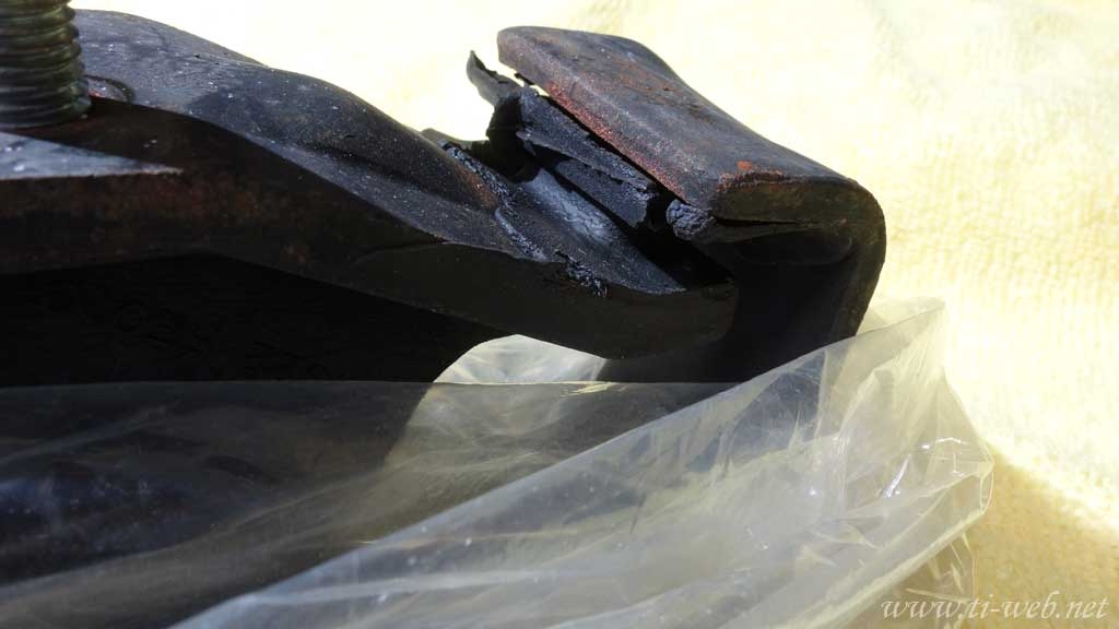 10万キロ以上走行しているWRX STI(VAB)のミッションマウントは、このようにゴムブッシュの部分が割れていました。マウントが、このような状態だとコーナリング中や加減速時の変速操作に悪影響が出ていたと推測されます。
